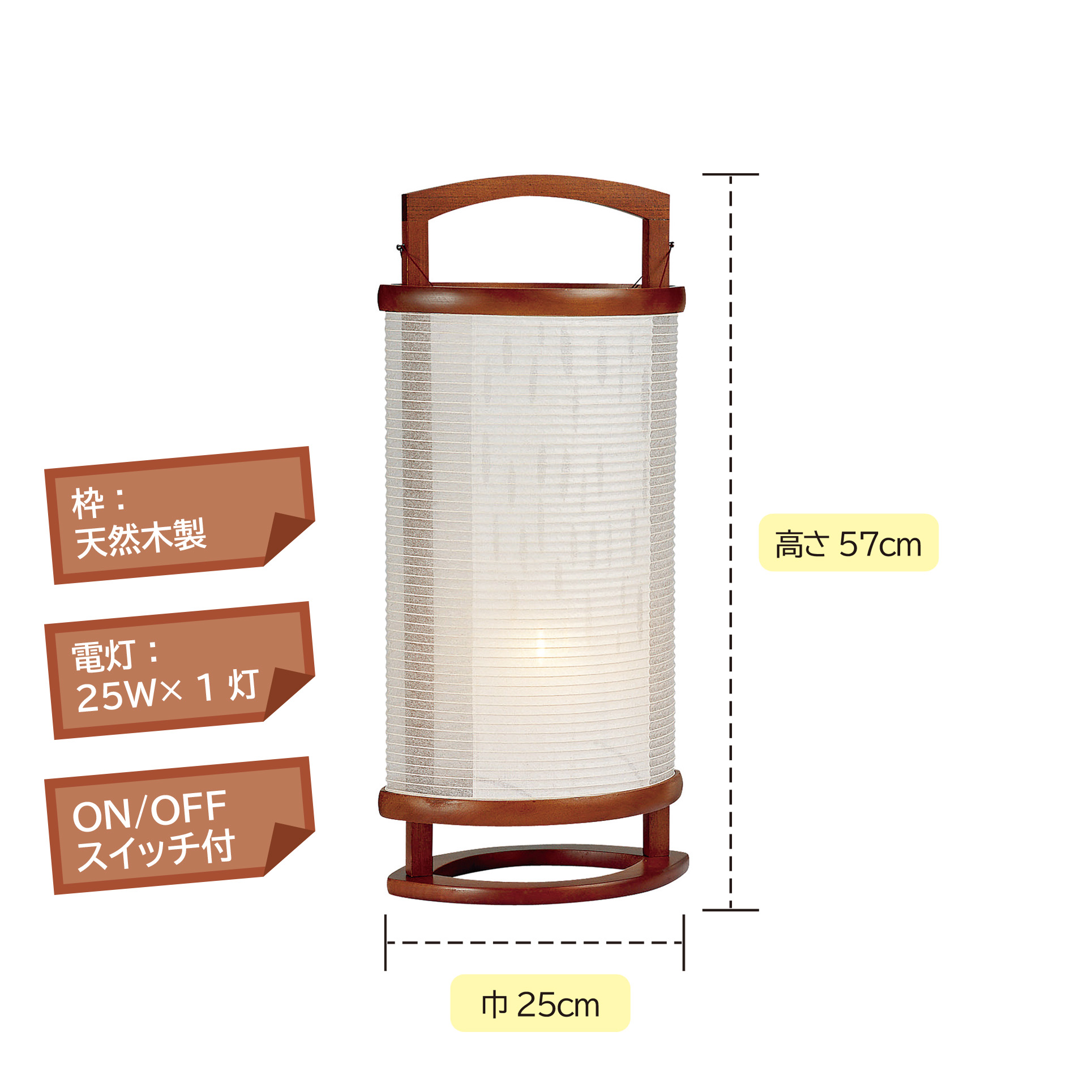 サイズ:巾25cm×高さ57cm 枠:天然木製 電灯:25W× 1 灯 ON/OFFスイッチ付