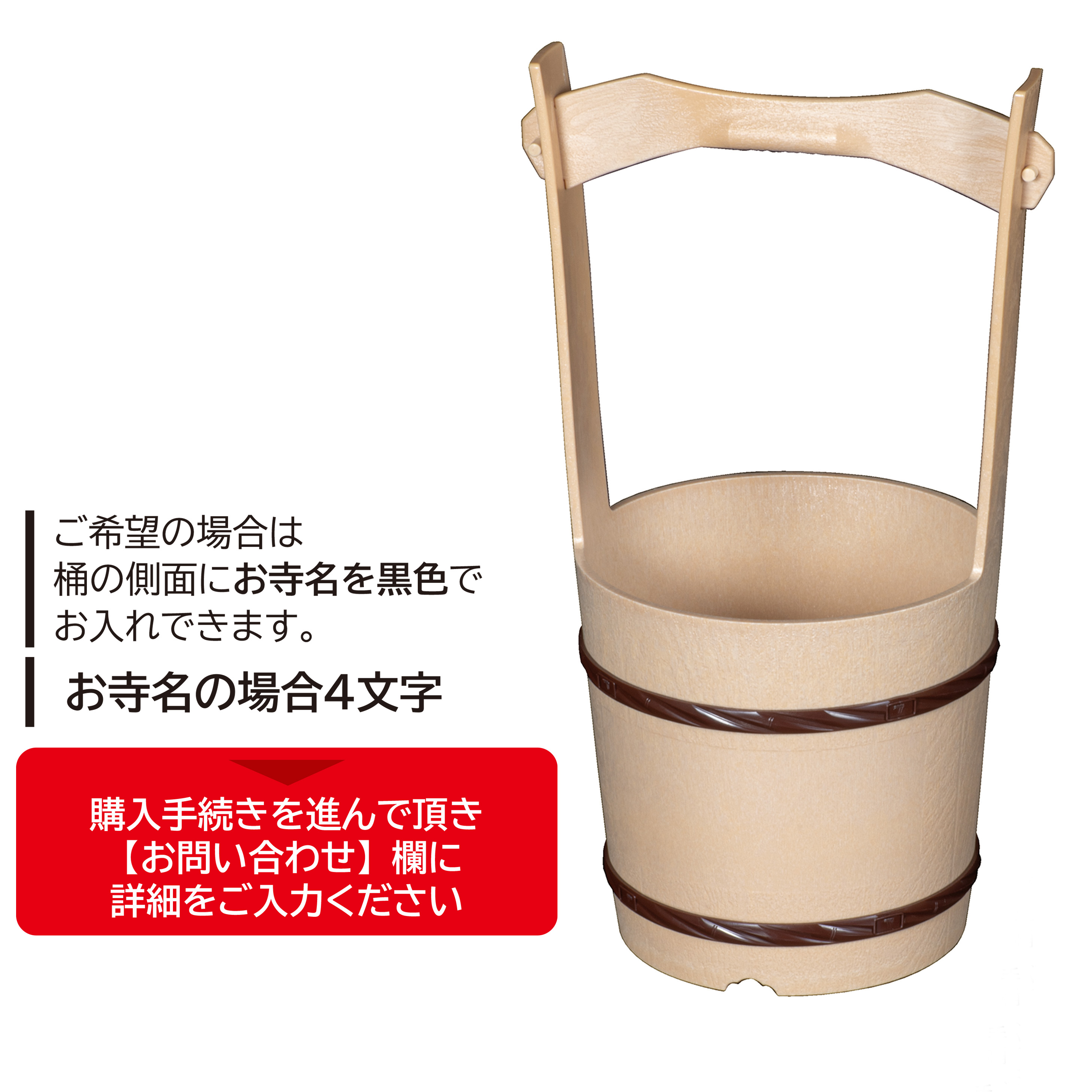 桶の側面に御寺名を黒色でお入れできます。ご希望の場合は、購入手続きを進んで頂き、 【お問い合わせ】欄に詳細をご入力ください。寺名の場合4文字まで。